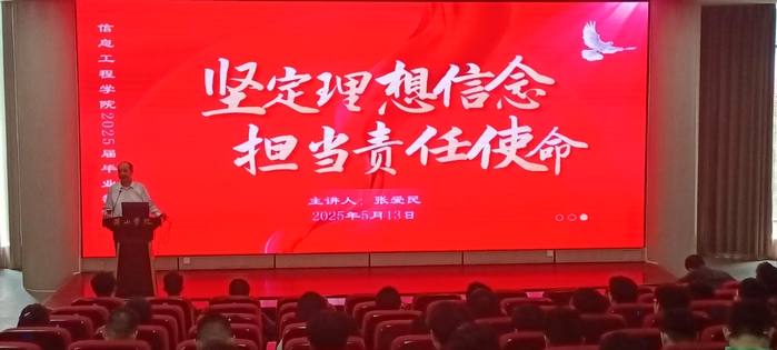 信息工程学院党委书记张爱民做“坚定理想信念担当责任使命”主题讲座,从五四运动的历史意义切入,剖析“爱国、进步、民主、科学”精神的当代内涵,号召毕业生以五四精神为炬,勇做新时代的“弄潮儿”。通过“目标锚定—行动转化—价值实现”三段式框架,强调毕业生需将个人理想融入国家需求,在基层实践、行业攻坚中践行青春誓言。以红色故事为引,串联学院实践成果,强化毕业生传承红色基因的责任感。最后,通过分享优秀校友及行业榜样事迹,为毕业生提供可借鉴的实践经验。