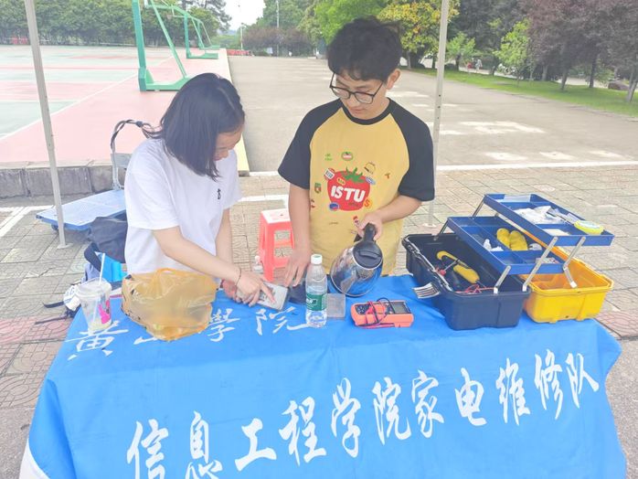 5月,信息工程学院家电维修队在校内成功开展义务维修活动两次,面向师生提供小型家电免费维修服务。活动现场,队员们运用万用表、电烙铁等专业工具,对师生送来的故障电风扇、台灯、电热水壶等家电进行细致检测与维修。在排除故障的同时,队员们还向师生讲解家电使用保养知识,积极倡导绿色环保理念。