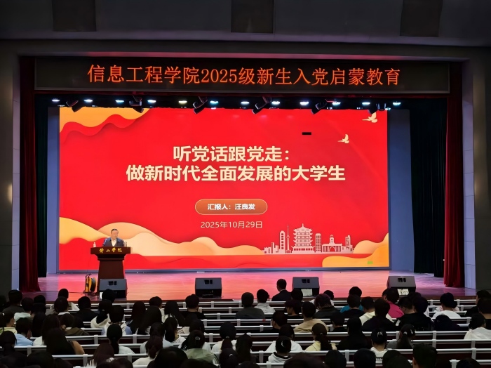 本次入党启蒙教育作为信息工程学院新生入学教育的核心环节,亦是学院党委深入推进党员发展工作、加强基层党组织建设的有力抓手。通过这一教育活动,引导青年学子坚定理想信念、明确成长方向,红色信仰的种子在2025级新生心中悄然扎根,更引导广大学子把个人理想追求融入国家发展洪流,以青春担当续写时代华章。