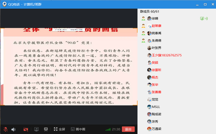 2020年4月26日,19计算机二班开展“绽放战疫青春,坚定制度自信”主题团日线上班会,同学们全部积极参与了此次班会,在线上班会中,团支书首先针对班级学习青年大学习情况进行发言,呼吁同学加入“青年大学习”学习热潮。其次针对习近平总书记给北大90后党员援鄂医疗队回信精神发表感悟。再由我们优秀疫情志愿者代表发言并分享心得。之后学委发言有关在此期间班级出现的学习问题和大家学习的态度与积极性。在下一环节中,同学们积极拿出准备好的五四相关曲目演唱或诗歌朗诵或有关青年战疫实迹,依次开麦进行演唱或者演讲,倡导五四青年精神。在最后播放本班同学制作的“五四精神,传承有我”视频,宣扬同学们心中的五四精神、以及对五四精神的理解。