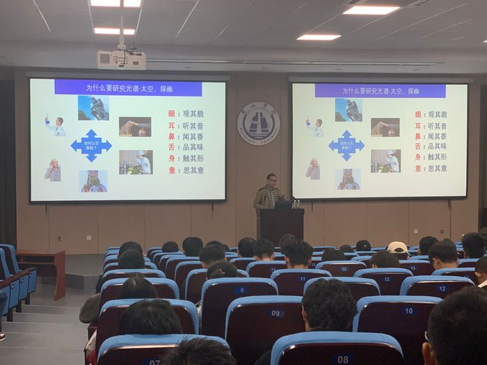 报告从光谱的定义、研究光谱的意义以及研究光谱的手段等几个方面展开。报告的最后,马堃博士介绍了近期开展与光谱相关的科研工作。报告内容丰富,深入浅出,形象生动。通过一个小时的报告,同学们认识到了光谱研究的重要意义,对如何从测量的光谱中提取极端环境下的信息产生了浓厚的兴趣,报告也激发了同学们探知新知识、学习新技能的热情。