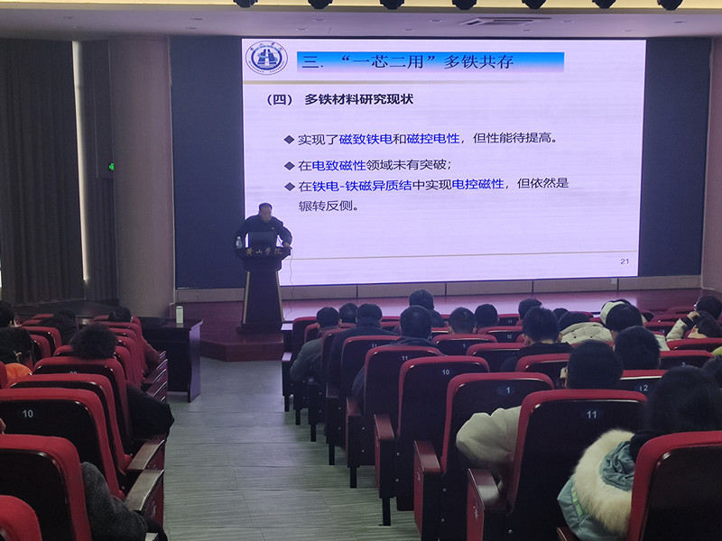 12月9日下午,行知讲坛第112讲在文端楼二楼报告厅举行。信息工程学院何聚博士做了题为《一芯二用——多铁材料》的报告,信息工程学院师生近300人参加了报告会,报告会由信息工程学院副院长官骏鸣主持。