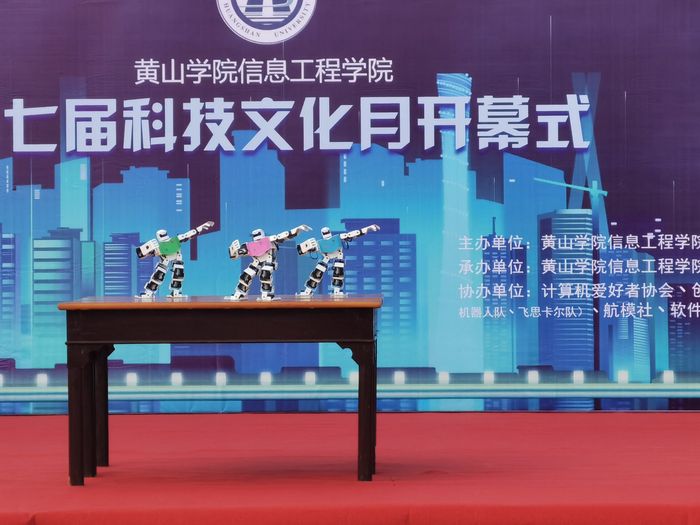 开幕式开始后,由信息工程学院副院长官骏鸣上台致辞,表达了对接下来的活动开展的期待和祝贺。随后,20级各班方队、家电维修队、计算机爱好者协会、软件小组、创新实验室、新视野航模社等方队逐一入场。在精彩的《舞魅》和《Kill This Love&helicopter》舞蹈表演后,歌曲《淘汰》和《天使的翅膀》相继上演,叶欣雨同学和机器人队分别带来《世间美好与你环环相扣》吉他表演和机器人舞蹈更是将此次活动推向了高潮,让观众大饱眼福。演出结束后,由信息工程学院党委书记刘承红宣布本次科技文化月正式开幕。开幕式结束后,各领导老师在幕布上签名并合影留念。