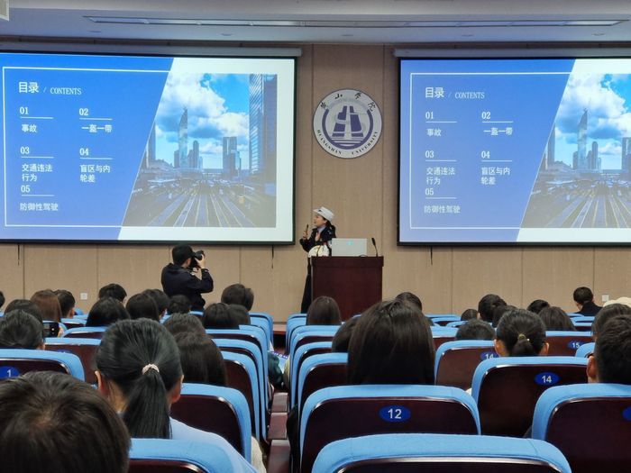 在交通安全讲座上,冯警官以高校校园内发生的一起交通事故引入,介绍了近几年黄山市辖区内发生的多起事故,震撼了学生。她用生动的案例、通俗易懂的语言、触目惊心的数字,向同学们展示了当前道路交通安全形势,讲解了道路交通安全知识,概括了易引发交通安全事故的行为和参与道路交通应注意的安全事项,同时介绍事故发生后的处置方式,引导大家要珍爱生命,做到文明、安全出行。
