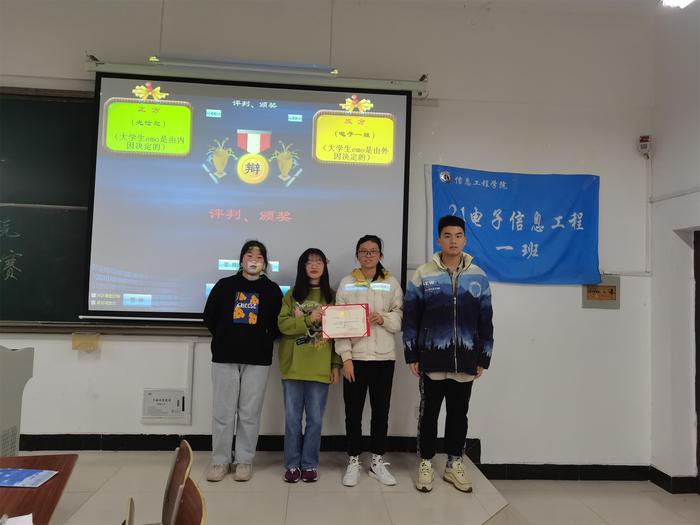 经过两轮激烈的筛选,21光信息班与21电子信息一班进入决赛。两个班级“围绕当代大学生emo是由内因还是外因”展开了激烈的讨论。比赛中针锋相对,辩手们精辟的措辞使得现场气氛迅速升温,双方辩手也对“夜晚emo的原因”这个辩题进行了精彩发言。比赛结束,经过评委打分,最终21电子一班荣获第一名,21光信息荣获第二名,21计算机二班荣获优秀奖,三个最佳辩手分别为唐松,汪笑,马润民。