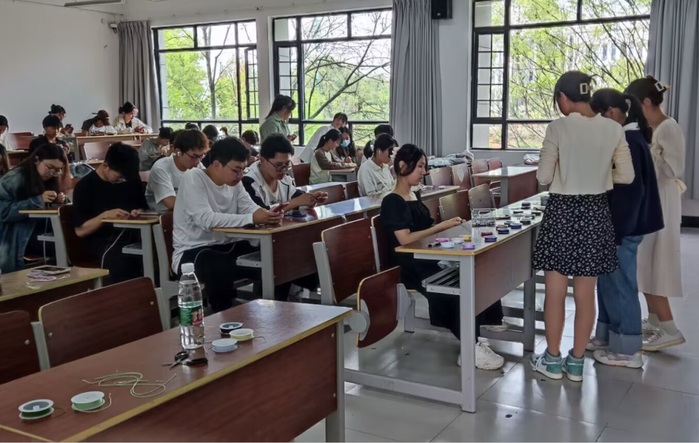 4月15日,信息工程学院开展手绳编织实践活动。主持人先为大家介绍了手绳的由来,之后,同学们观看手绳编织教学视频,领到所需材料后便迅速开始了编织,随着彩绳在指尖穿梭,一个个精巧玲珑的手绳就编织出来了,大家互帮互助,在欢声笑语中体会到了手绳文化的魅力。