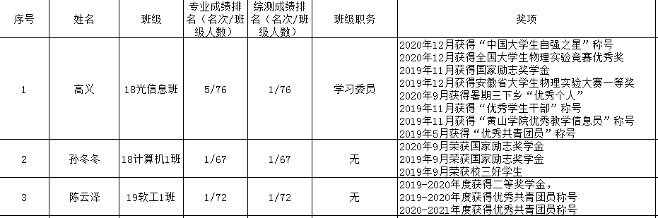 根据安徽省教育厅《安徽省教育厅关于做好2021-2022学年学生资助工作的通知》(皖教秘〔2021〕324号)、《黄山学院国家奖学金管理办法》(校学〔2020〕8号)要求,进行信息工程学院国家奖学金评审,拟推荐高义、孙冬冬、陈云泽三位同学为2021年国家奖学金获得者。现公示如下: