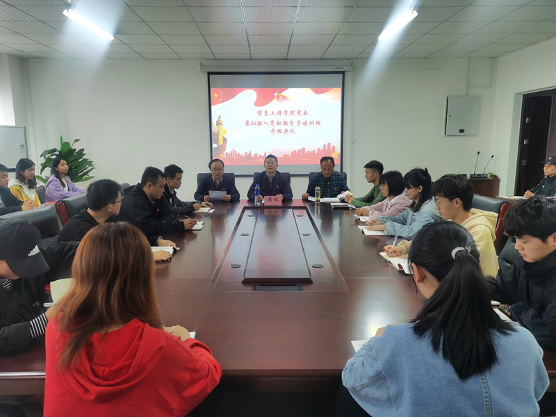 2020年10月21日,信息工程学院分党校第5期入党积极分子培训班开班仪式在学院会议室举行。校党委委员、组织部长周权出席开班仪式并讲话,信息工程学院党委书记刘承红、学院院长、党委副书记吕海江、学生支部书记及60名入党积极分子参加开班仪式,开班仪式由吕海江支持。